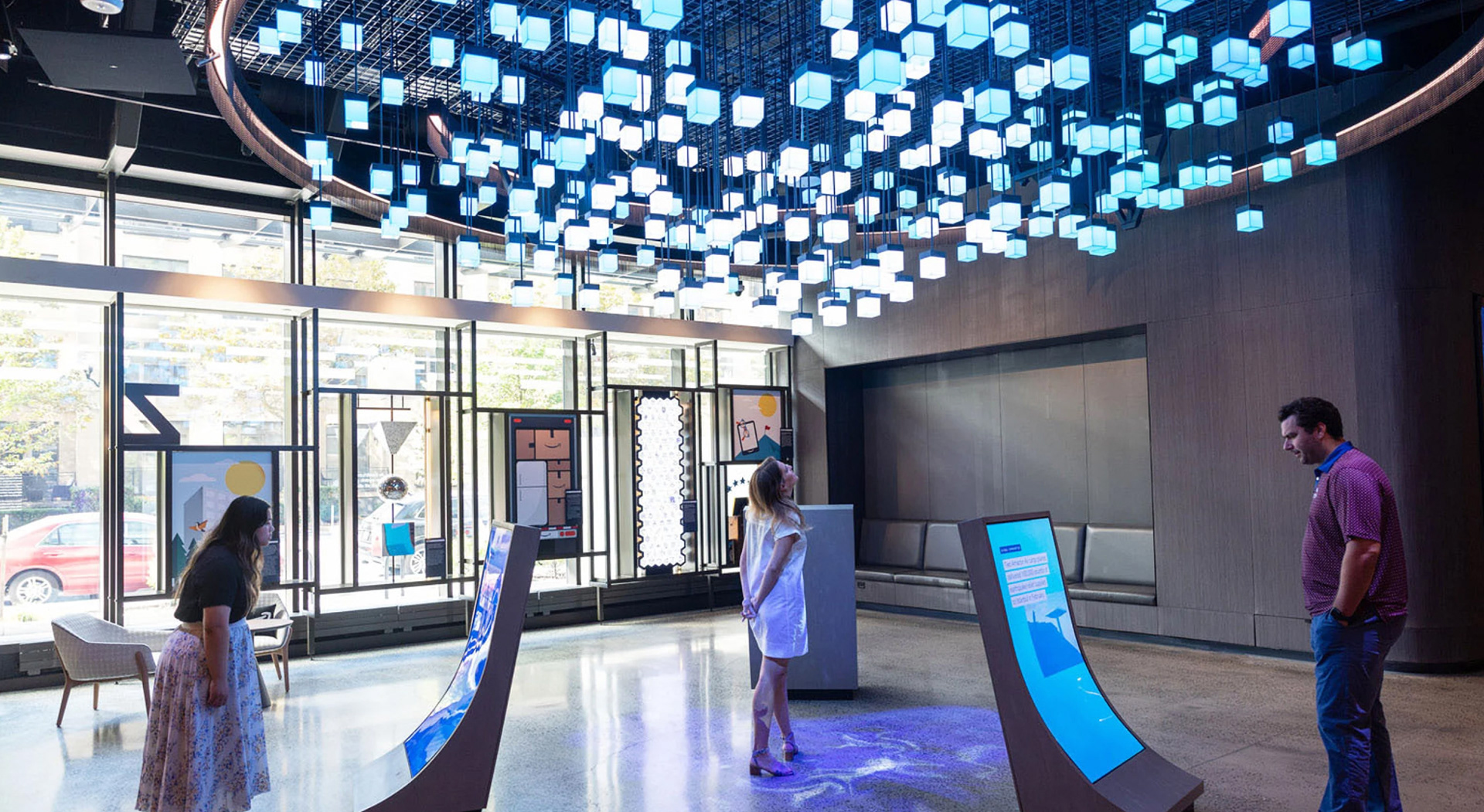 Virginia based corporate hospitality center for innovation focused storytelling encompassing biophilic design elements, interactive digital media, integrated brand graphics, and physical fixture design.